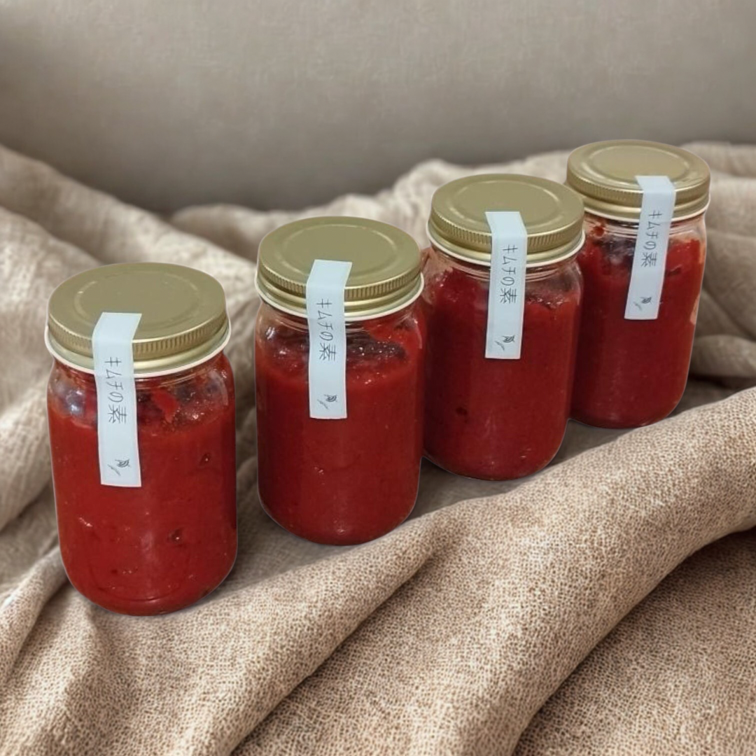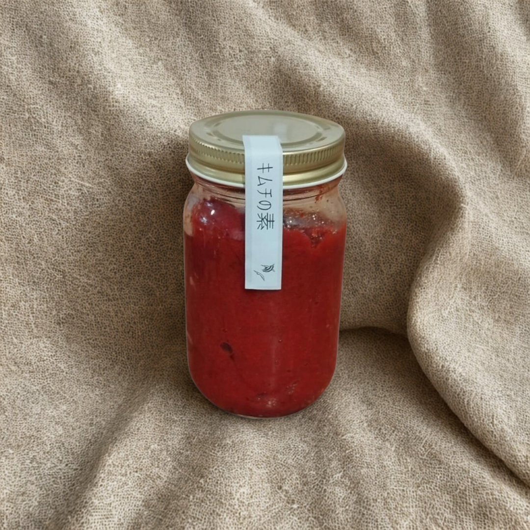 This kimchi base is made with 100% plant-based ingredients, without using shrimp or seafood as seasonings. It uses oligosaccharides for sweetness instead of refined sugar, and uses akkeshi grass salt to bring out richness and umami, with other ingredients carefully selected. It's a natural kimchi base with a light and gentle flavor that's delicious even though it's plant-based.