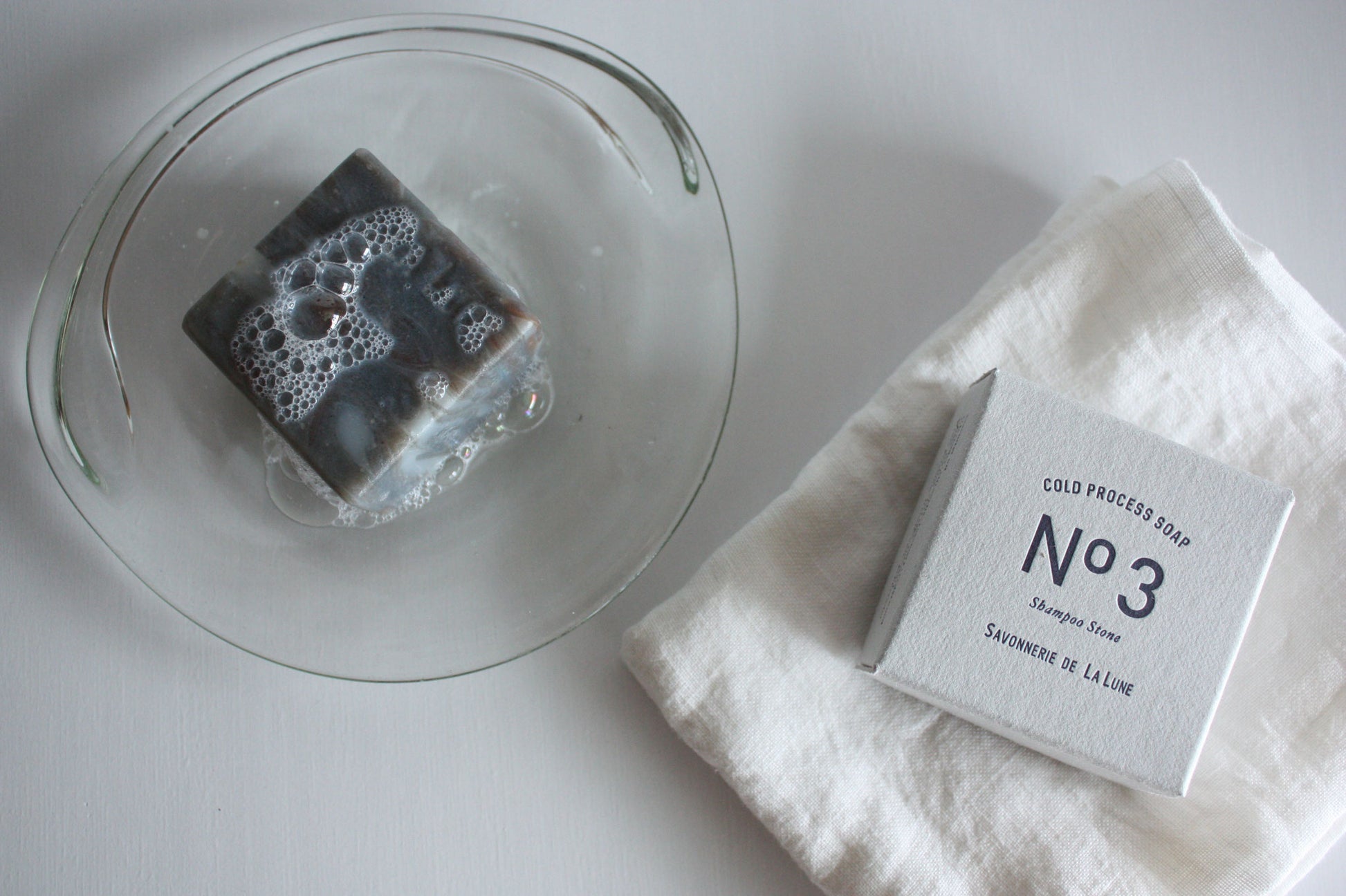 We made many prototypes to create a soap that is more suitable for shampooing, and finally created this. We created a recipe that lathers well but is also less likely to melt and crumble. We added cocoa butter and shea butter to create a luxurious, rich, and fine lather that is also moisturizing and suitable for washing your face.