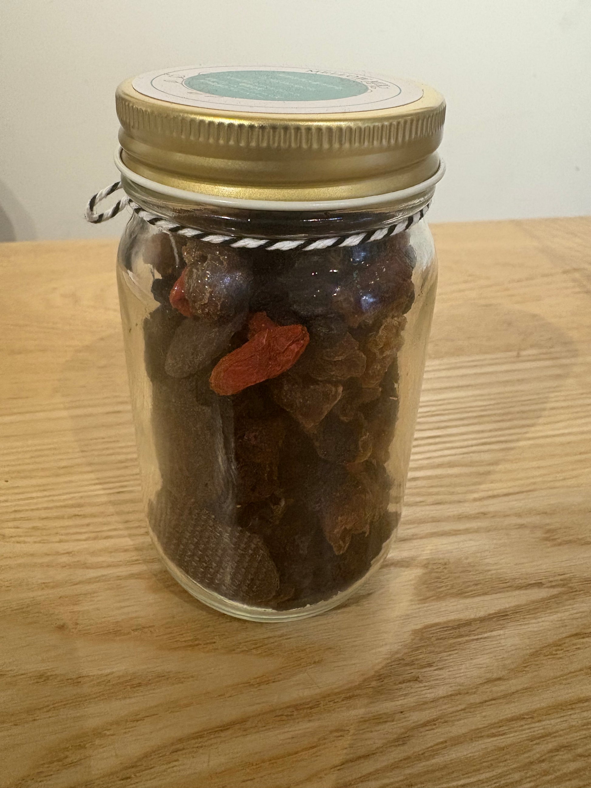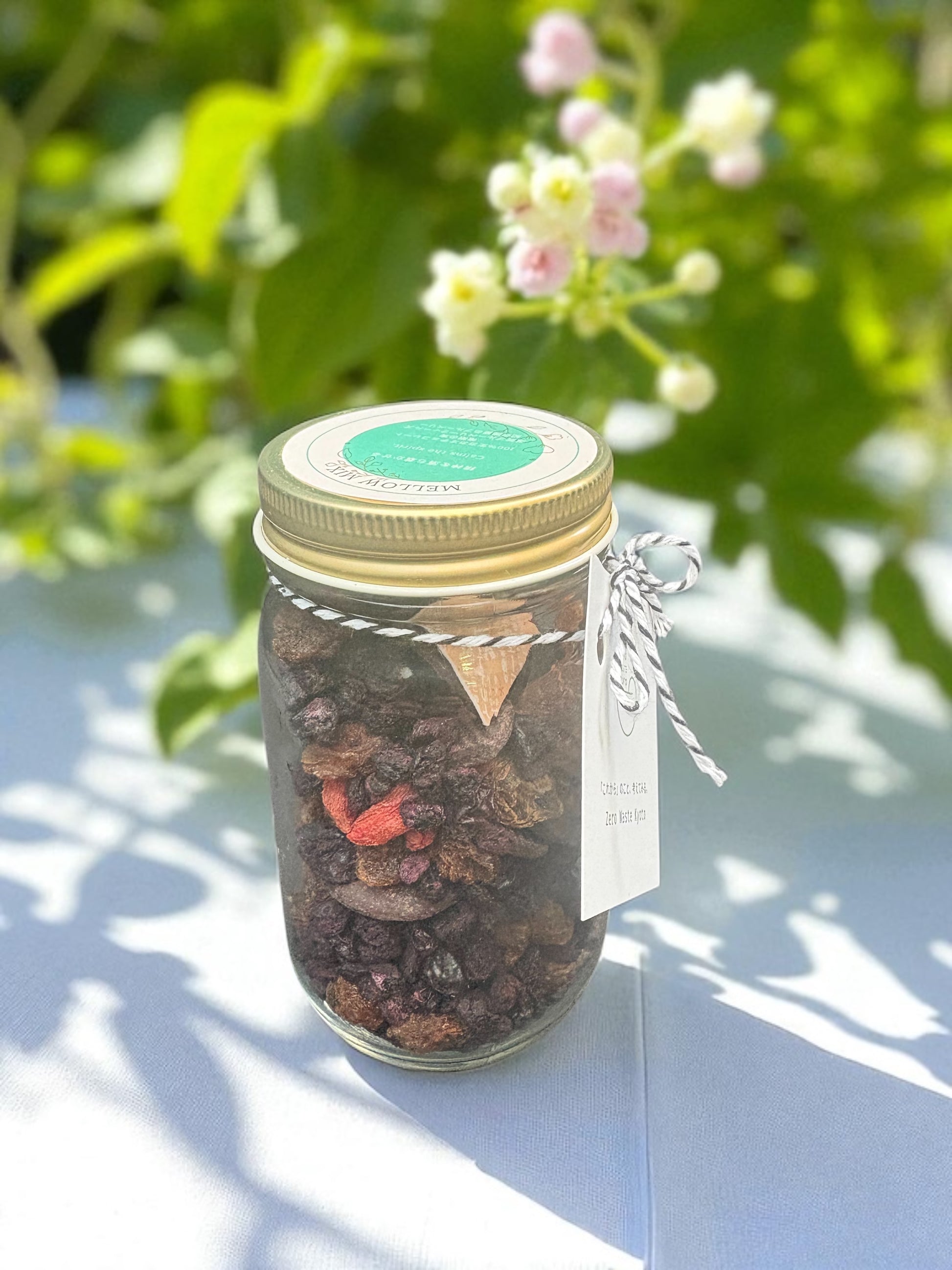 Mellow Mix is a blend of 100% Ecuadorian Arriba cacao chocolate, longan, a plant prized in traditional Chinese medicine for its calming properties, and bilberry, the ancestor of blueberries. This blend gently supports the balance of mind and heart, inner and outer, for modern people.