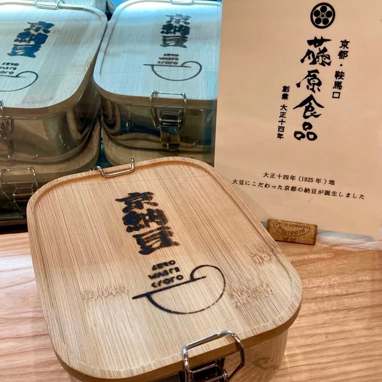 The natto, which is prepared in a stainless steel lunch box (with a wooden lid) created through a collaboration between "Kyoto Natto x Zero Waste Kyoto," contains a whopping 500 grams (one pack of Fujiwara's natto is 80g, so this is about 6 packs plus a little more. In terms of the typical size of commercially available natto packs, this is the equivalent of about 10 packs!) Each lunch box and can is packed with fermentation power.