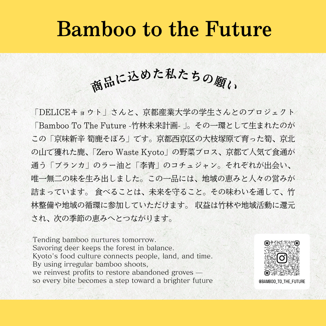 京都大枝塚原で筍と柿を生産されているたはらのうえんを運営しているDELICEキョウトさんと、京都産業大学経営学部の学生さんとのプロジェクト「Bamboo To The Future」。その活動の一環として生まれたのがこの「京味新辛 筍鹿そぼろ」です。