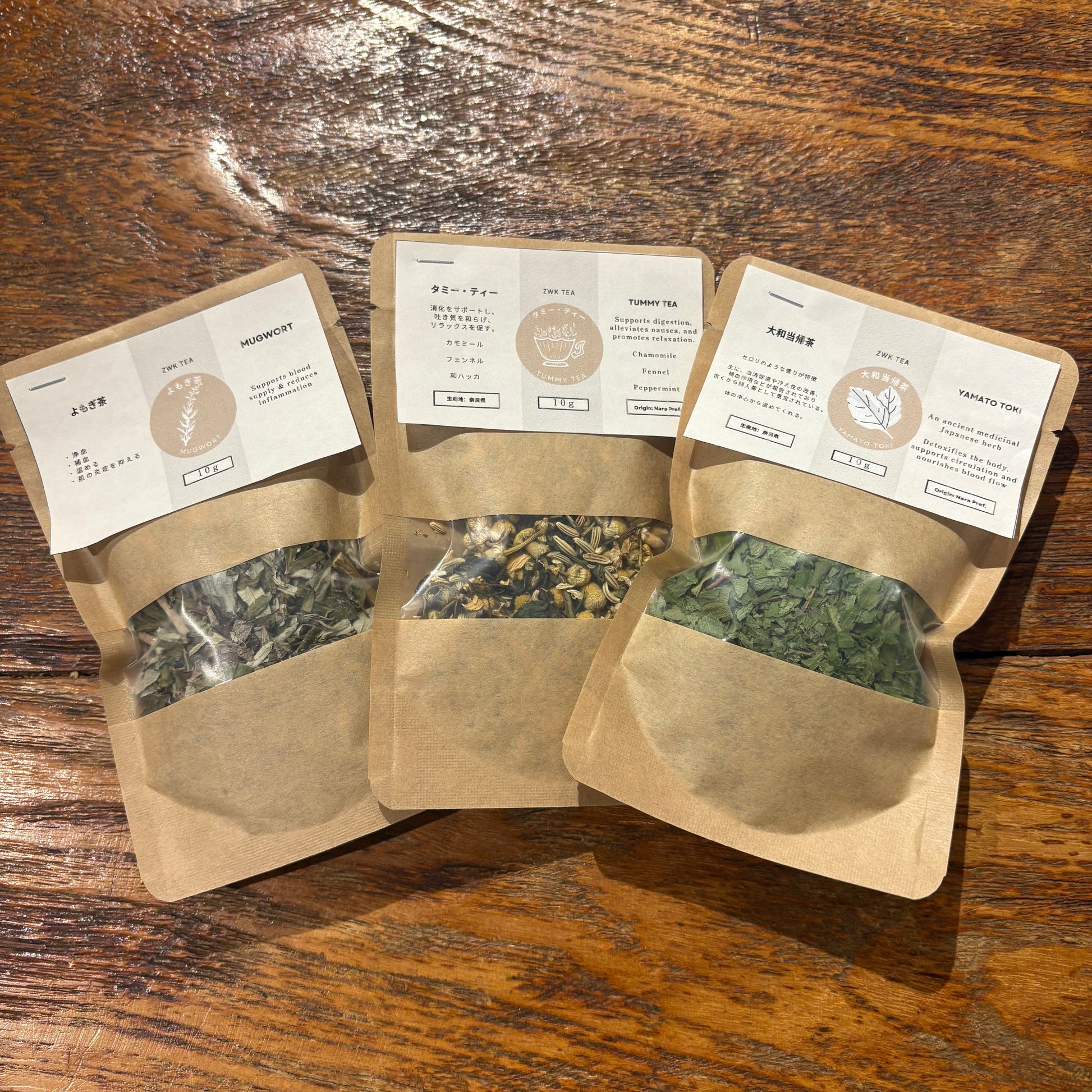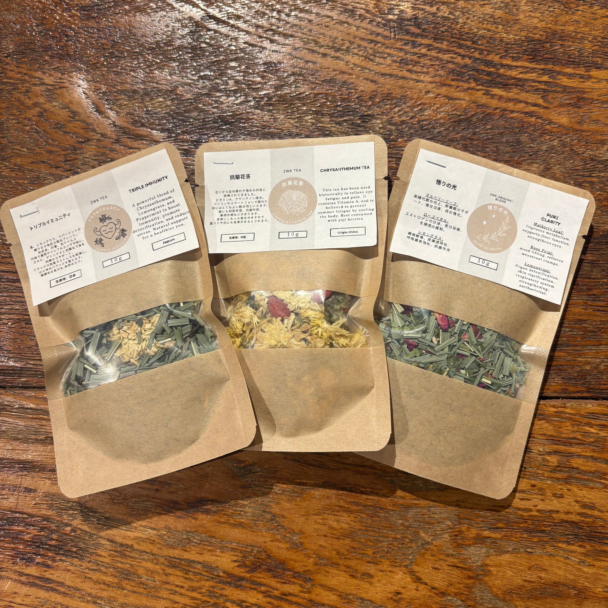 忙しい日々の中で、ふと立ち止まるひととき。ZWKのオリジナルブレンドを含む温活、身体を温め活性化する効果のあるお茶を少量づつ3種類セレクトしてみました。